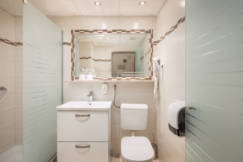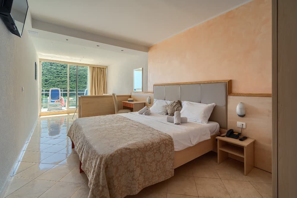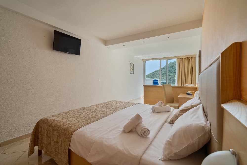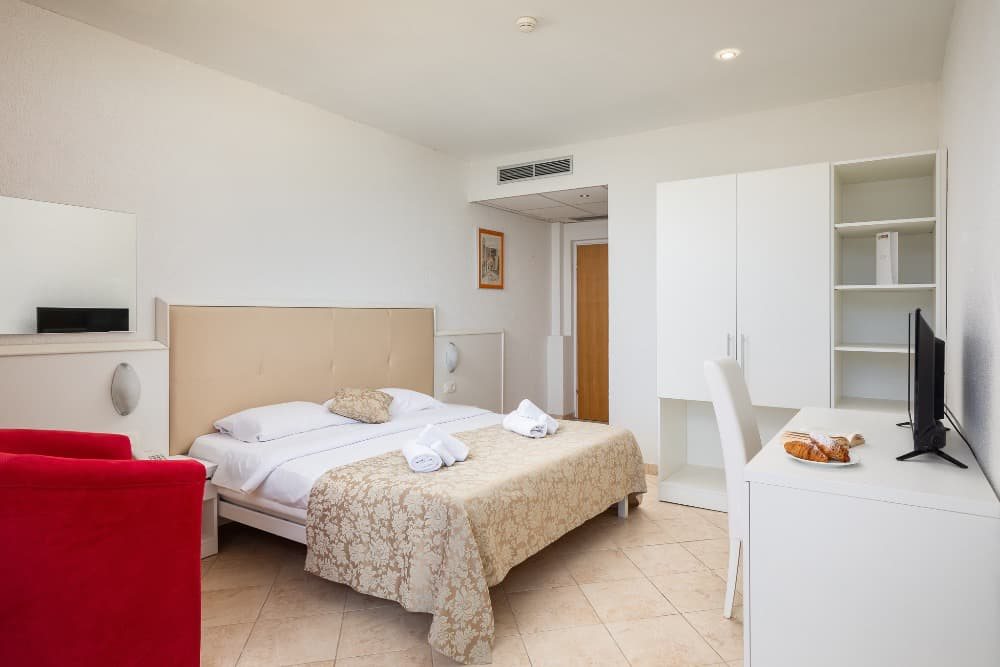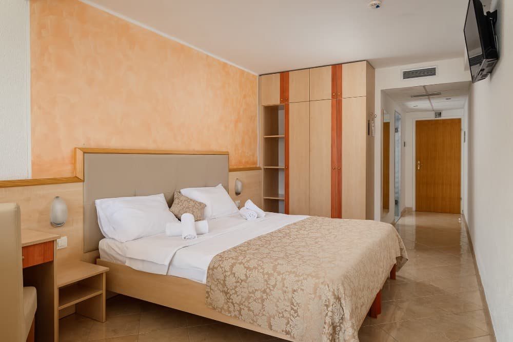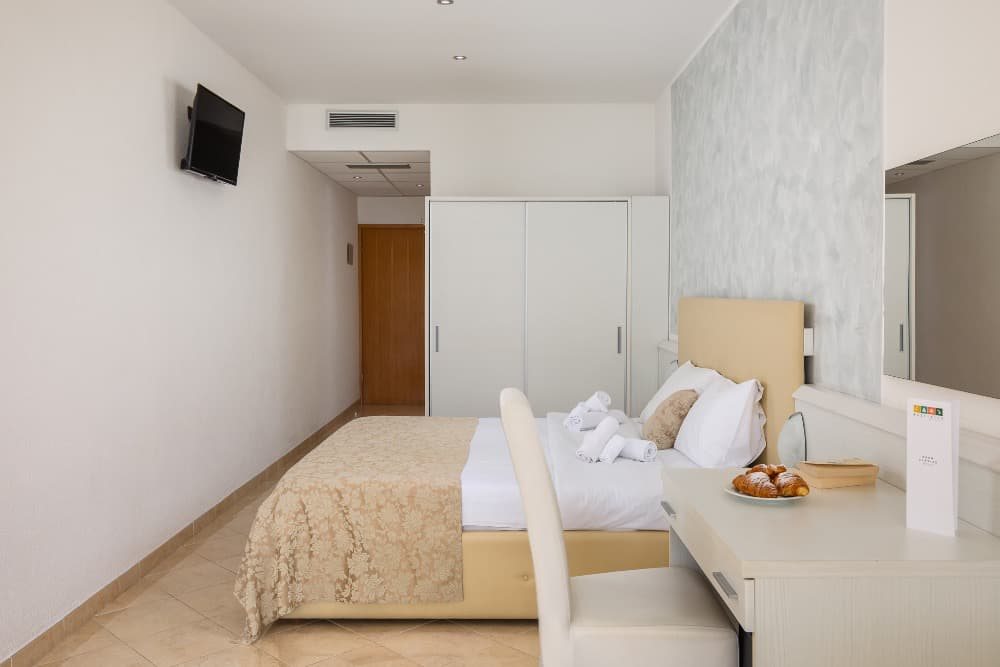 dvoulůžkové pokoje s balkonem na mořskou stranu s možností 1-2 přistýlek (S2MB, S3MB a S4MB) , dvoulůžkové pokoje směr park/ulice bez možnosti přistýlky (S2) a jednolůžkové pokoje směr park/ulice (S1) . Všechny pokoje jsou vybavené koupelnou se sprchou a WC, fénem, telefonem, SAT TV a mají klimatizaci. V pokojích 1/2+2 BM jsou 2 přistýlky ale pouze na jedné z nich, může být ubytována 3. dosp. osoba.