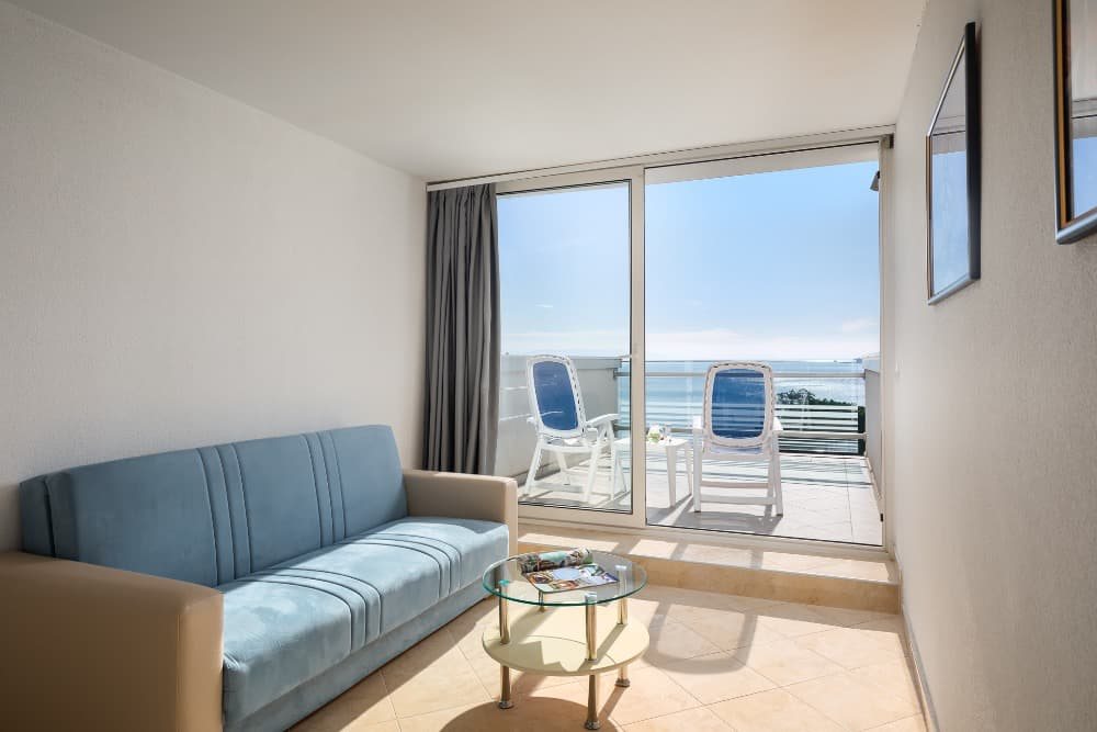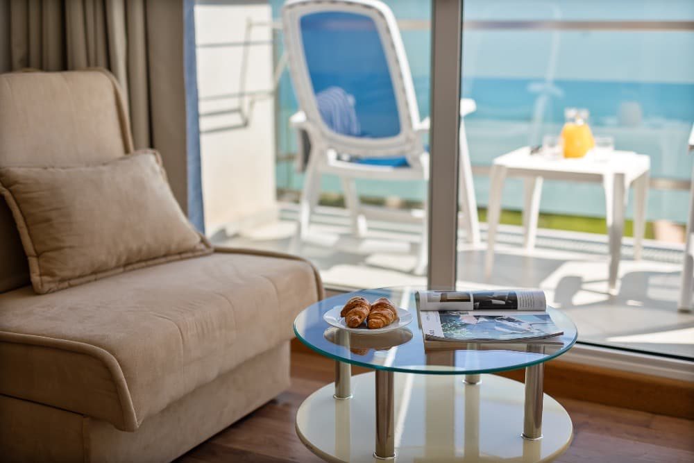 Dvoulůžkový pokoj standard s balkonem na mořskou stranu a dvěma přistýlkami (S4MB) (25 m2) - moderně zařízený prostorný dvoulůžkový pokoj se dvěma přistýlkami je vybaven sociálním zařízením (sprcha, toaleta, fén) telefonem, klimatizací, satelitní TV, trezorem, minibarem a balkonem nebo terasou. Dětská postýlka na vyžádání.