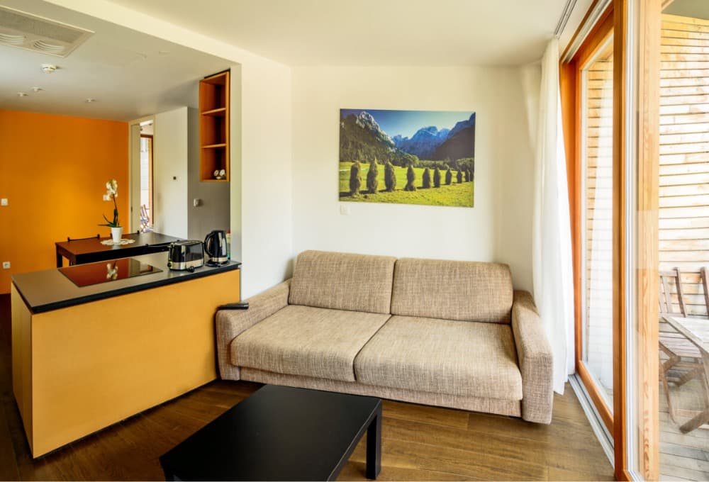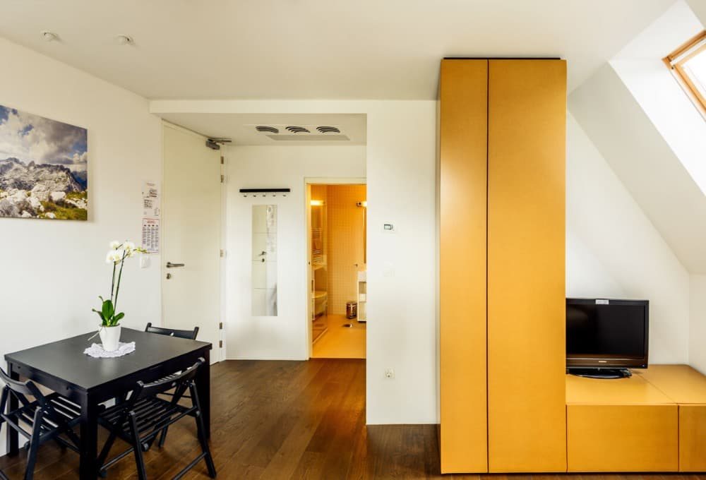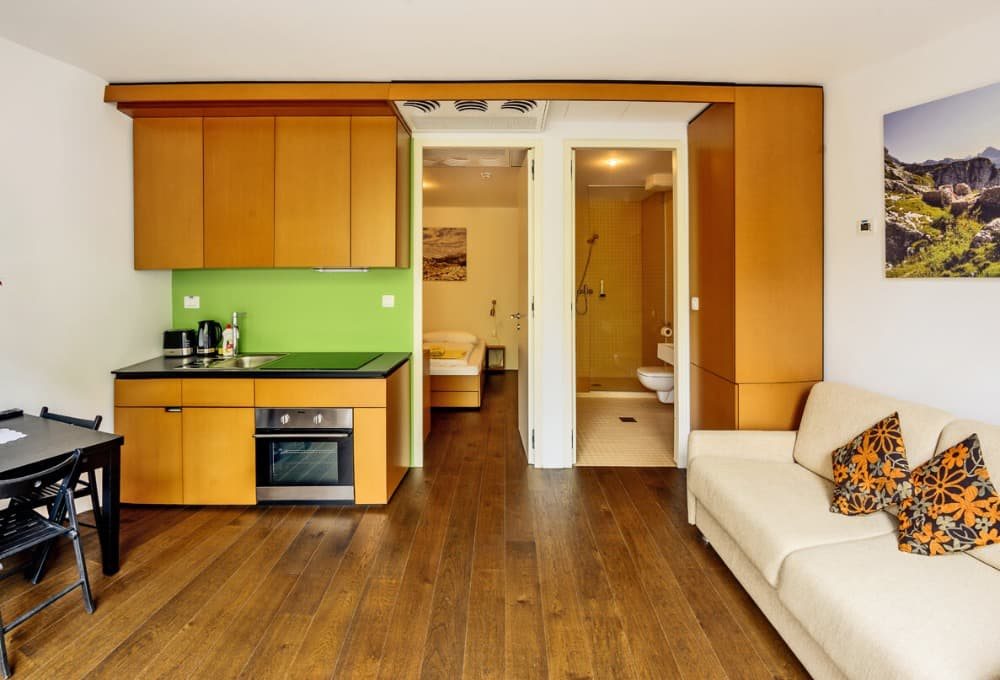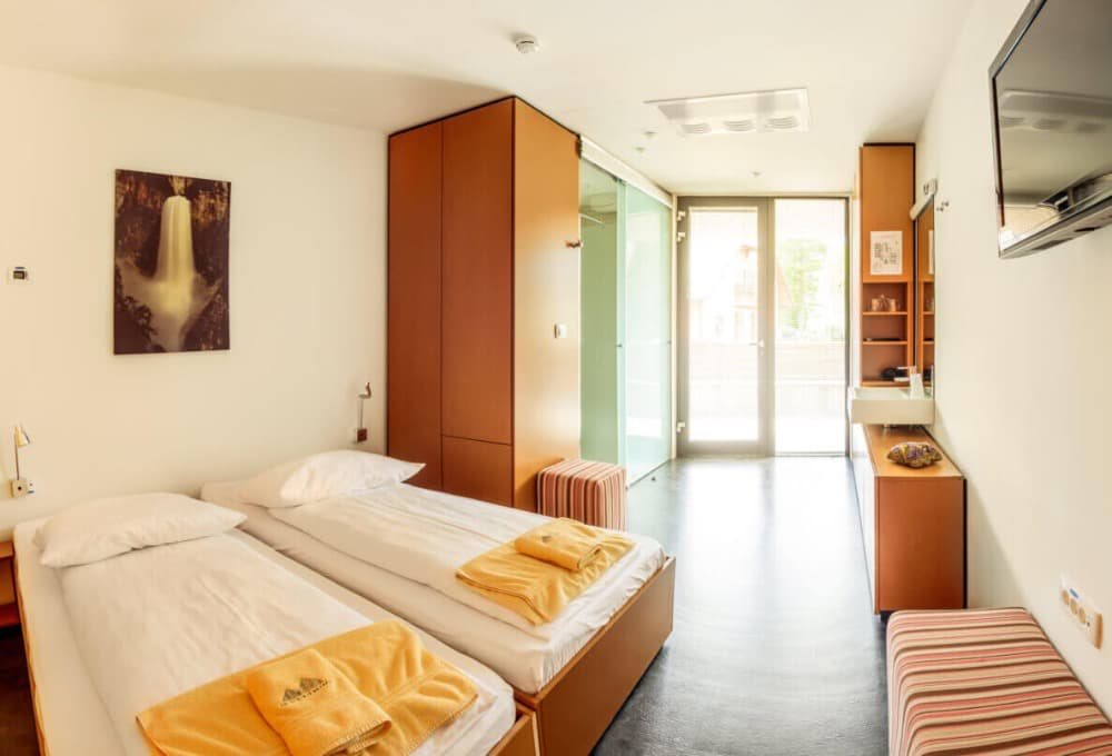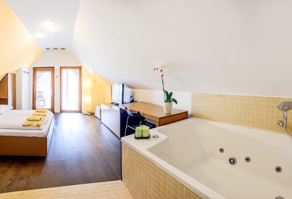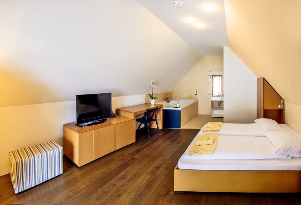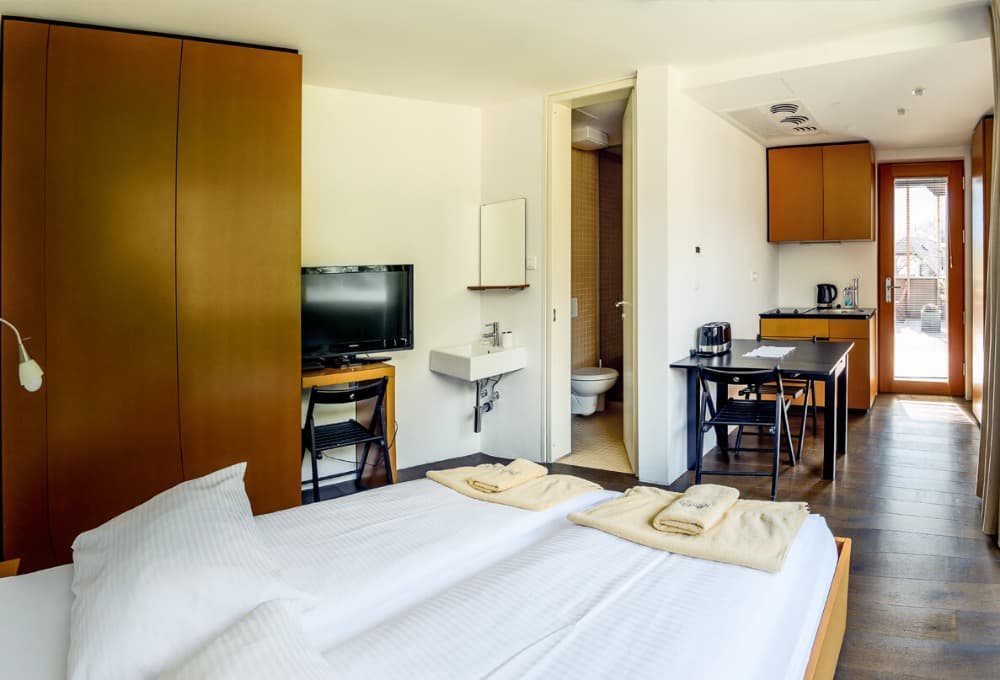 Vybrat si můžete z pohodlných jednolůžkových a dvoulůžkových pokojů, oblíbený je i dvoulůžkový pokoj s vířivkou pro soukromý relax. Pro delší pobyty a rodiny jsou k dispozici studia a apartmány různých velikostí (2+1, 2+2 a 3+2) s ložnicí/emi, koupelnou, vybavenou kuchyní a obývací částí (často s rozkládacím gaučem). Díky tomu snadno zkombinujete výlety s domácím komfortem.